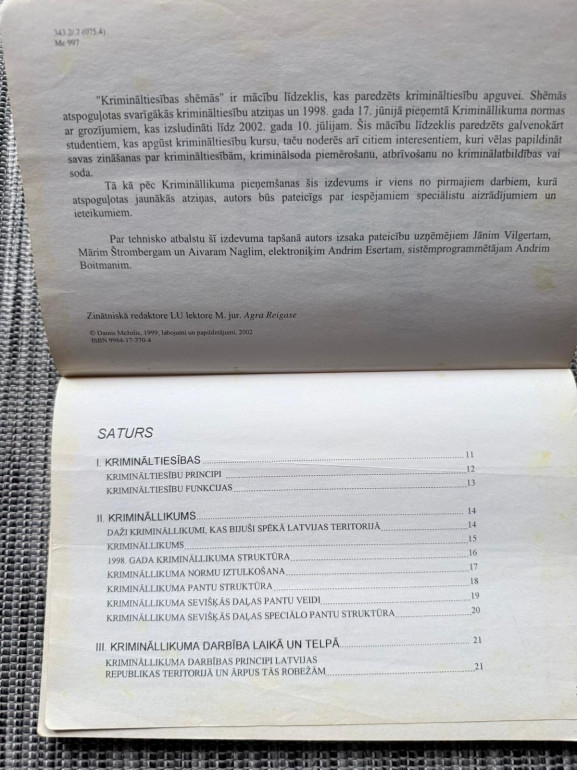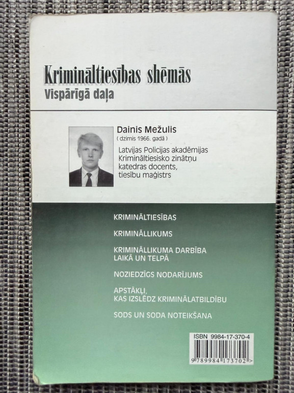 | Šī grāmata ir vizuāli strukturēts ceļvedis Latvijas krimināltiesību pamatos. Tajā galvenie institūti, normas un procesi ir attēloti shēmās un tabulās, kas palīdz ātri uztvert likumsakarības un sistēmu. Piemērota studentiem, juristiem un ikvienam, kas vēlas saprotami apgūt krimināltiesību principus | |