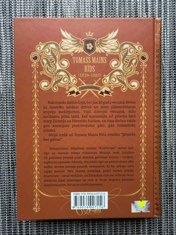 | Tomasa Mainsa Rīda romāns "Kvarterone" ir romantisks un dēkpilns stāsts, kas aizved lasītāju uz Luiziānas zemēm 19. gadsimta pirmajā pusē. Galvenais varonis – tumšādainais jaunietis Edvards – cīnās pret rasistiem vergturiem, lai glābtu savu saimnieci un atrastu savu tēvu. Romāns apvieno piedzīvojumu garu ar romantisku cēlumu, raksturīgu Rīda daiļradei. | |