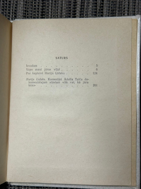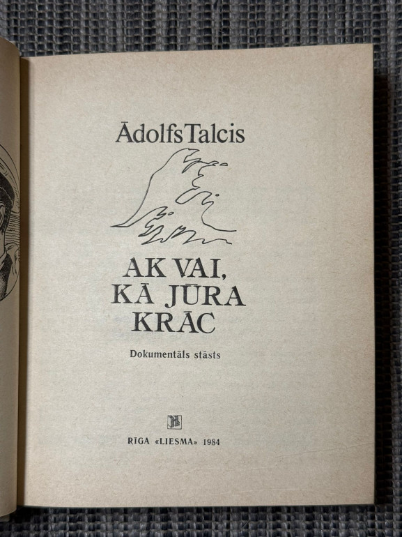 | “Ak vai, kā jūra krāc” (Ādolfs Talcis) – dokumentāls stāsts par jūras varenību un cilvēka attiecībām ar dabu. Autors atklāj jūrnieku gaitas un piekrastes dzīvi, balstoties uz personiskiem novērojumiem un pieredzi. Izdots 1984. gadā, 218 lpp. | |