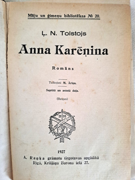 | Ļ.N.Tolstoja romāna "Anna Karēņina" 7 un 8 daļa. Izdota 1927.g. A.Raņķa grāmatu un tirgotavas apgādībā. Tulkojusi M.Āriņa. | |
