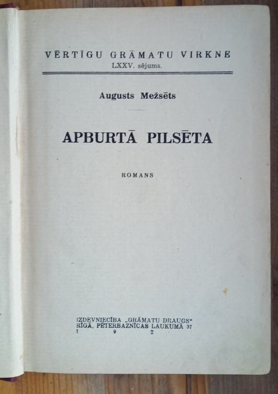 | "Grāmatu draugs", Rīgā, 1929. gads. 222 lpp. Vāki apbružāti, lapas dzeltējušas. Uz aizmugurējā vāka balts traips. | |