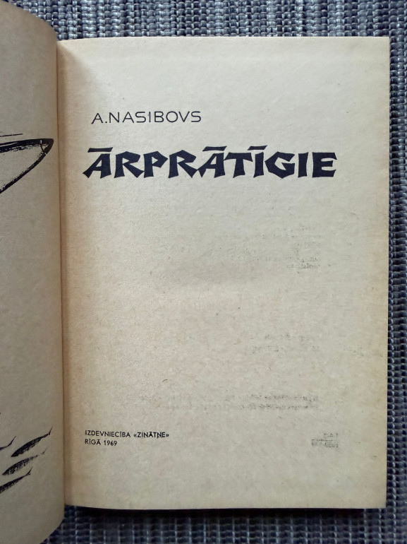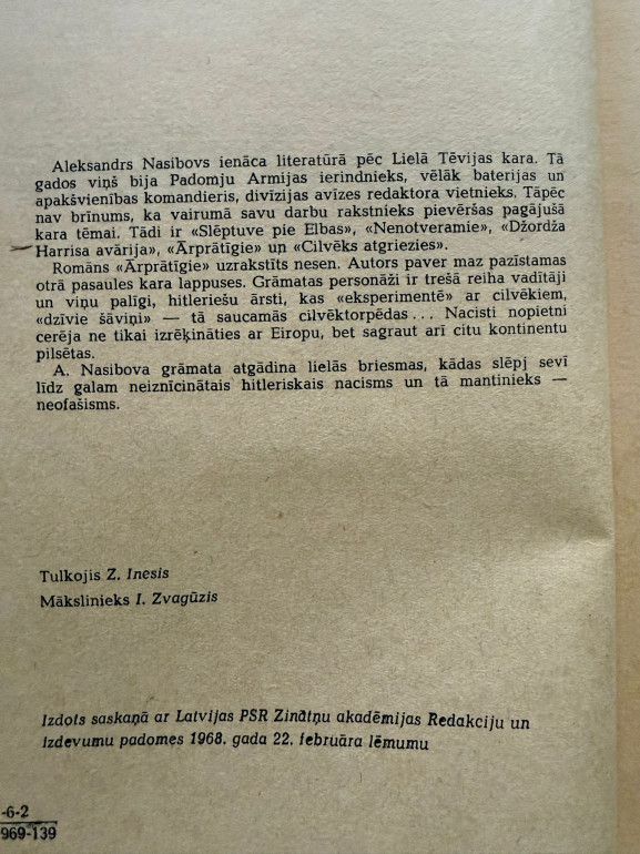 | “Ārprātīgie” – Aleksandra Nasibova romāns par maz zināmām Otrā pasaules kara lappusēm: Trešā reiha vadītāji, ārsti un šausminošas cilvēku “eksperimentu” epizodes. Darbs atgādina nacisma un neofašisma briesmas. Latviešu izdevums: Zinātne, 1968, tulkojis Z. Inesis. | |