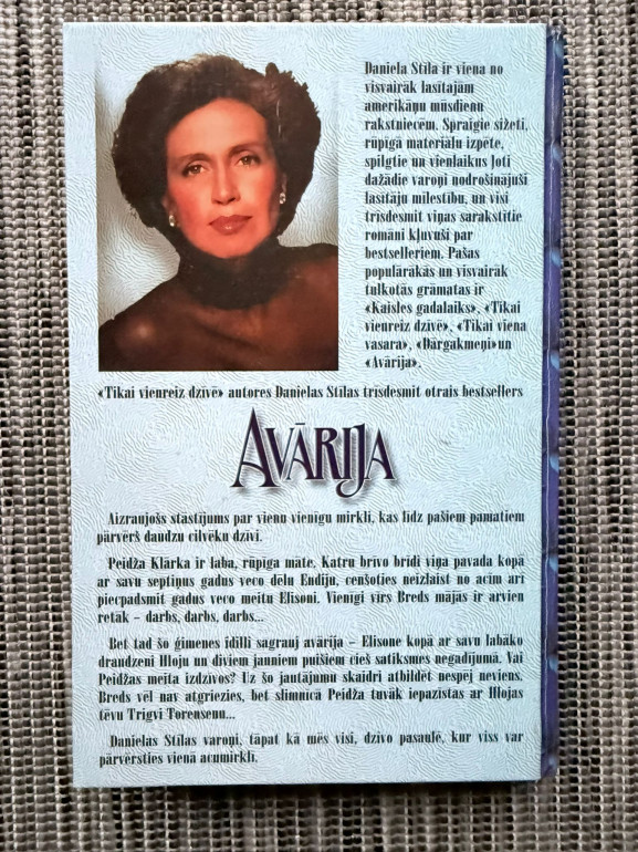 | Grāmata “Avārija” ir Danielas Stīlas dramatisks romāns par vienu mirkli, kas satricina ģimeni: pusaudžu izklaide noslēdzas ar smagu avāriju, un Peidžai Klārkai jācīnās par meitas dzīvību, jāsastop vīra nodevība un jāatrod atbalsts negaidītā vietā. Stāsts par izturību, mīlestību un pārmaiņām vienā acumirklī. | |