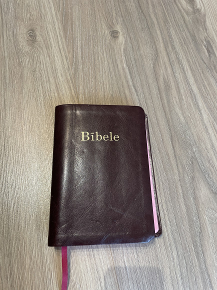 | Zīdpapīra lapas; bordo krāsas dabīgās ādas vāki ar zelta krāsas iespiedumu un noapaļotiem stūriem; grāmatzīme - auduma lente; sārti krāsota lapu griezuma virsma. Vecā un Jaunā Derība. Pielikumi: 1.Īsa Bībeles skaidrojošā vārdnīca, 2. Bībeles manuskripti, 3.Saīsinājumi. 4.Krāsainas vēsturiskās kartes latviešu valodā. | |