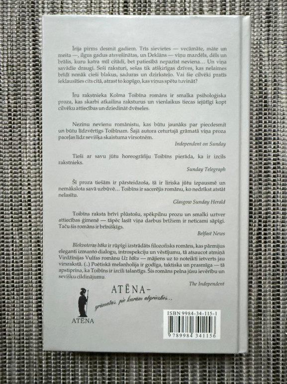 | Vēl plēves iesaiņojumā. „Blekvoteras bāka” ir Kolma Toibīna romāns par īru ģimeni 20. gadsimta sākumā. Grāmata stāsta par attiecībām starp māti un dēlu, klusām spriedzēm, reliģiju un identitāti, atklājot emocionālu distanci un neatrisinātus konfliktus ģimenē. | |