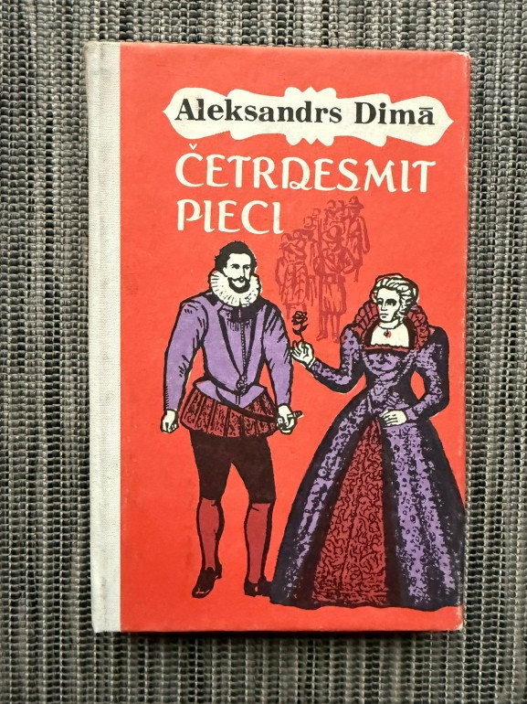 | Grāmata “Četrdesmit pieci” (Aleksandrs Dimā, 1847) ir trešā daļa ciklā par Valuā dinastiju, turpinājums romānam “Grāfiene Monsoro”. Sižets norisinās Henrija III valdīšanas laikā, kad Franciju plosa reliģiskie kari. Romānā atklātas galma intrigas, Guisa sazvērestības un Anžū hercoga liktenis, savijot politiku, nodevību un kaislības. | |