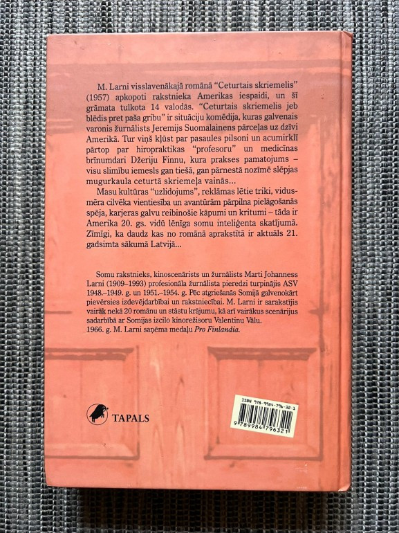 | Grāmata Ceturtais skriemelis (Marti Larni) ir ironisks un asprātīgs romāns par cilvēku vājībām, attiecību sarežģījumiem un dzīves absurdiem. Autors caur humoru un paradoksiem atklāj sabiedrības kontrastus, padarot stāstu gan izklaidējošu, gan filozofiski pārdomu rosinošu. | |