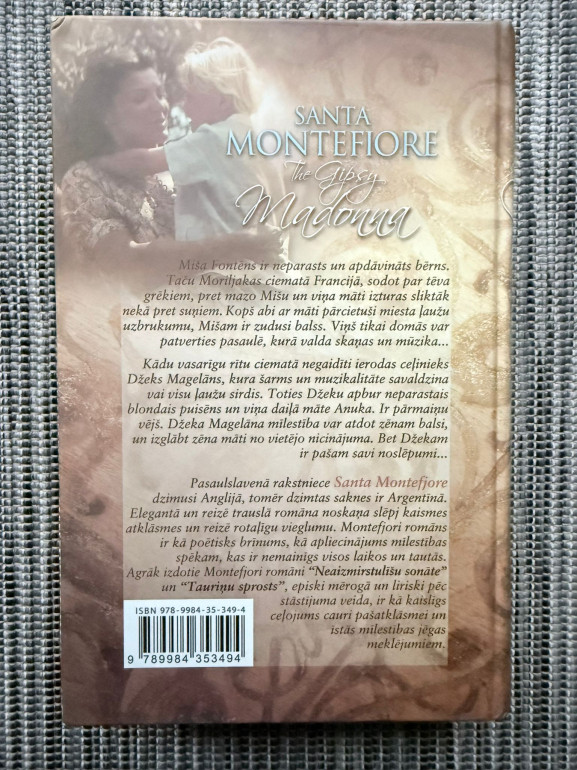 | Grāmata “Čigānu madonna” ir Santas Montefjores romantiskas drāmas un vēsturiska noslēpuma romāns par franču antikvari Anūku un viņas dēlu Mišu: pēc Anūkas nāves Ņujorkā atklājas, ka viņa slēpusi neaprakstītu Ticiana meistardarbu “Čigānu madonna”, kas dēlu aizved atpakaļ uz bērnības Bordo un pēc kara rēto, noslēpumu un piedošanas meklējumiem. | |