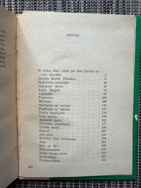| Stāstu krājums par cilvēku jūtām, attiecībām un dzīves skaudrumu. Autors meistarīgi savieno romantiku ar ironiju, radot emocionāli piesātinātus tēlus. Īpašs ar Ezeriņam raksturīgo smalko psiholoģiju un valodas eleganci. | |
