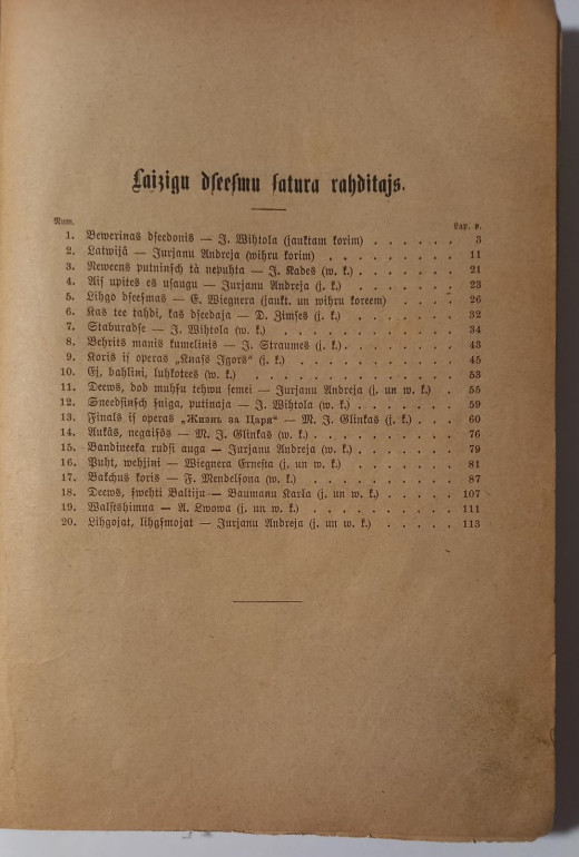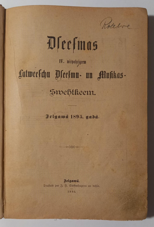 | Jelgava : Stefenhagens, 1895. gads Saturā laicīgās un garīgās dziesmas ar atsevišķu pagināciju: 156 lpp. un 170 lpp. Kora dziesmas ar un bez pavadījuma. Vecajā ortogrāfijā. | |