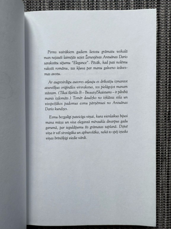 | Elegance ir Ketlīnas Tesāro romāns par stilu, dzīves izvēlēm un personīgo izaugsmi. Grāmata ir īpaša ar smalku, estētisku stāstījumu un uzmanību detaļām, kas atklāj tēlu raksturus un dzīvesveidu. | |