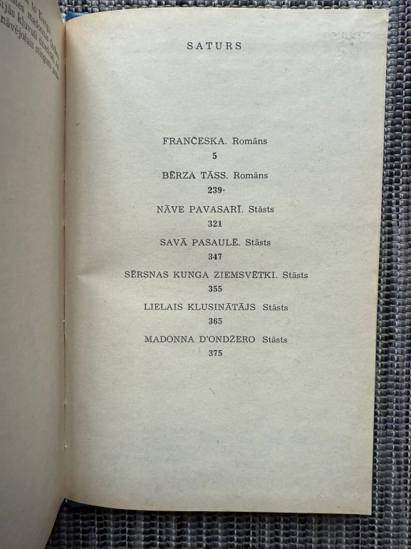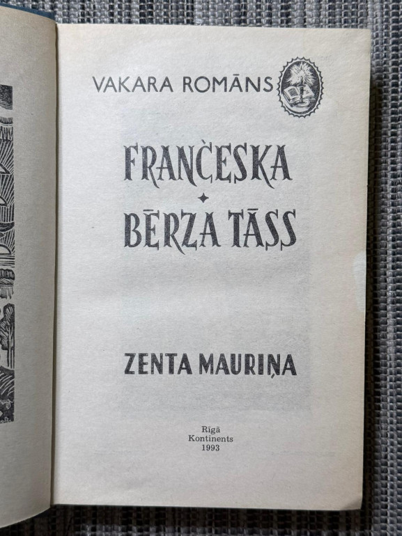 | Grāmata “Frančeska. Bērza tāss” ir apvienots izdevums: romāns “Frančeska” par jaunas sievietes garīgo briedumu, mīlestību un ideāliem, un stāstu krājums “Bērza tāss”, kurā Zenta Mauriņa raksta par dzīves jēgu, skumjām un cerību poētiskā, aforismiem bagātā valodā. [Frančeska....atu draugs], [jekabpils....lioteka.lv] | |