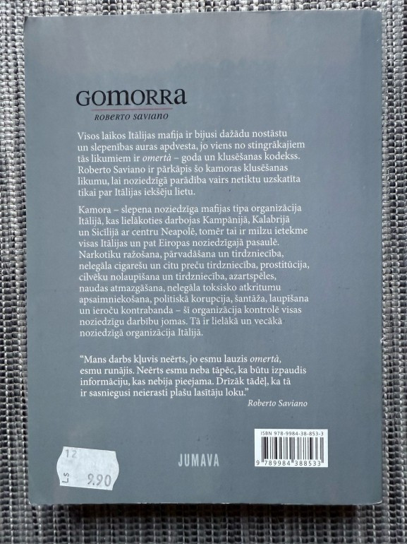 | Gomora ir Roberto Saviano grāmata, kas atklāj Neapoles mafijas organizācijas – Kamoras – darbību un ietekmi uz ikdienas dzīvi Itālijā. Grāmata ir īpaša ar rūpīgu izpēti, faktu precizitāti un drosmi atklāt noziedzības sistēmas realitāti. | |