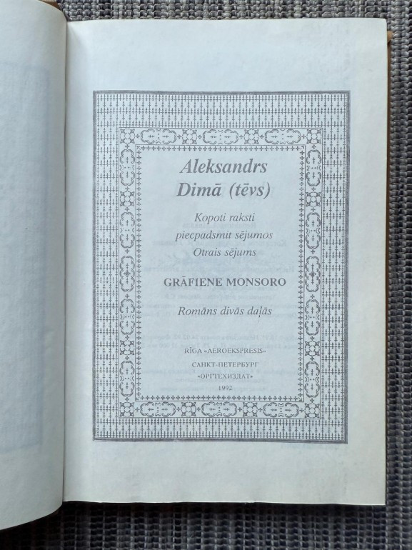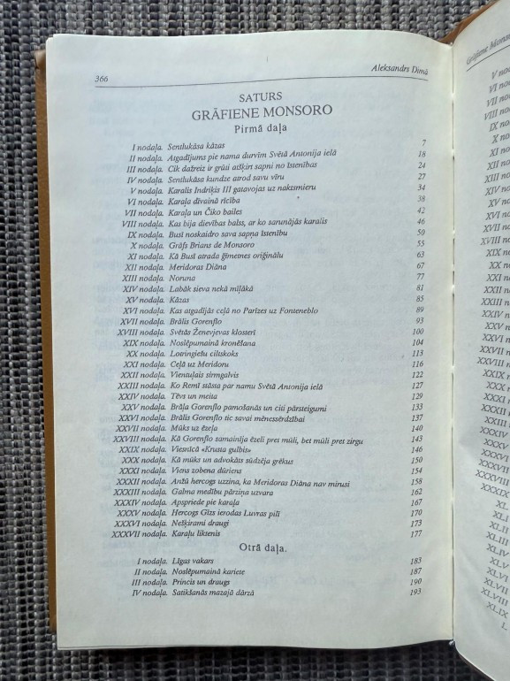 | Kopoto rakstu 2. sējums. Grāmata “Grāfiene Monsoro” (Aleksandrs Dimā, 1846) ir vēsturisks piedzīvojumu romāns, kas norisinās 16. gadsimta Francijā Henrija III valdīšanas laikā, kad valstī plosās reliģiskie kari. Sižeta centrā ir mīlas intriga starp drosmīgo grāfu de Buši un Diānu de Monsoro, kura spiesta apprecēties, lai glābtu savu godu un izvairītos no karaļa brāļa uzbrukumiem. | |