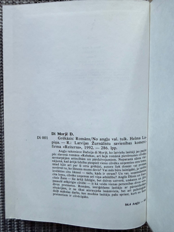 | “Grēkāzis” (1957) — psiholoģisks romāns par angļu vēsturnieku Džonu, kurš Francijā satiek savu līdzinieku, grāfu Žanu de Gē. Pēc identitāšu maiņas Džons spiests pārņemt svešu dzīvi — ģimeni, krītošu stikla fabriku un bīstamus noslēpumus. Spriedze par identitāti, vainu un atbildību, kad “otra” loma sāk mainīt pašu. | |