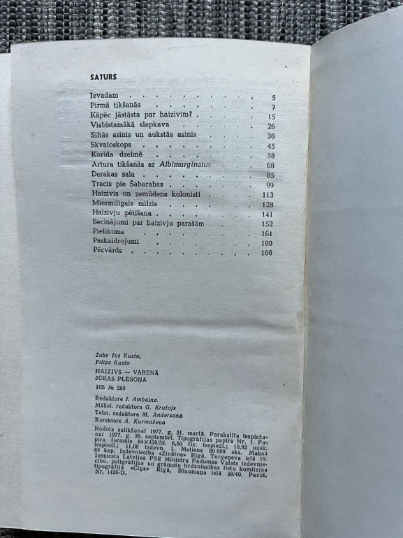 Grāmata “Haizivs – varenā jūras plēsoņa” (Žaks Īvs Kusto, Filips Kusto, 1978) ir populārzinātnisks darbs no sērijas Apvārsnis, kurā autori pēta haizivju uzvedību, bioloģiju un nozīmi okeāna ekosistēmā. Balstoties uz zemūdens ekspedīcijām, grāmata atspēko mītus par haizivīm kā aklām slepkavām, parādot tās kā sarežģītus un pielāgotus jūras iemītniekus. [Haizivs -...- ibook.lv] | |