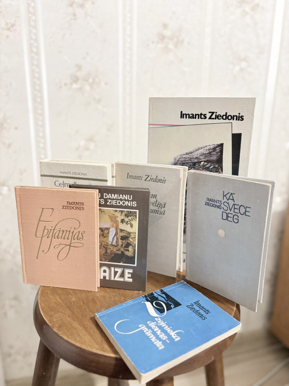 | Imants Ziedonis - Zvejnieka dienasgrāmata. Izdev. Liesma 1965. Imants Ziedonis - Epifānijs. Liesma 1974. Imants Ziedonis, Liviu Damianu - Maize. Liesma 1982. Imants Ziedonis - Man labvēlīgā tumsā. Liesma 1979. Imants Ziedonis - Kā svece deg. Liesma 1971. Imants Ziedonis - Ceļmallapas. Liesma 1983. Imants Ziedonis - Taureņu uzbrukums. Liesma 1988. 10 EUR par visu. | |