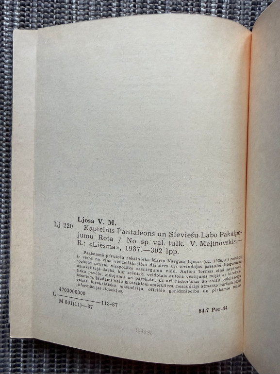 | Satīrisks romāns par armijas birokrātiju un morāli. Kapteinim Pantaleonam jāizveido slepena “pakalpojumu rota”, lai apmierinātu kareivju vajadzības. Viņš izpilda pavēli ar pedantisku degsmi, līdz pats kļūst par sistēmas upuri. | |