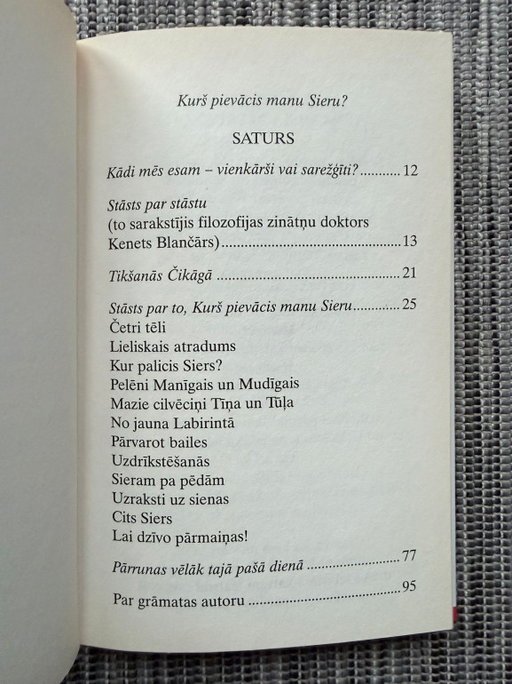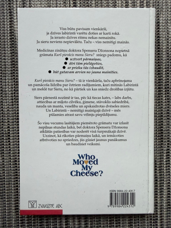 | Grāmata „Kurš pievācis manu sieru?” stāsta par pārmaiņu pieņemšanu. Alegoriskā stāstā četri tēli labirintā meklē sieru, kas simbolizē dzīves mērķus. Grāmata māca nebaidīties no pārmaiņām, pielāgoties un doties uz priekšu, lai atrastu jaunas iespējas. | |