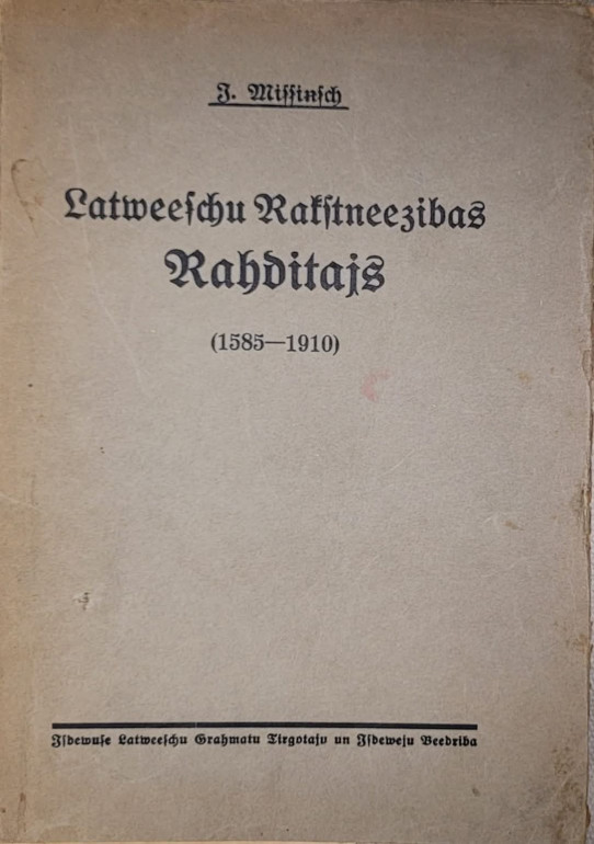 | J.Misiņš "Latviešu Rakstniecības Rādītājs 1585 - 1910", 1924.gada izdevums, 744 lpp., cena 58,-€, stāvoklis labs, atrodas Rīgā, sūtu, ātrākai saziņai WhatsApp tālr.29535459 . | |