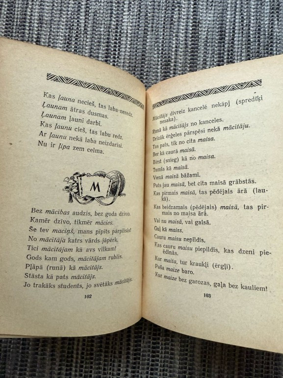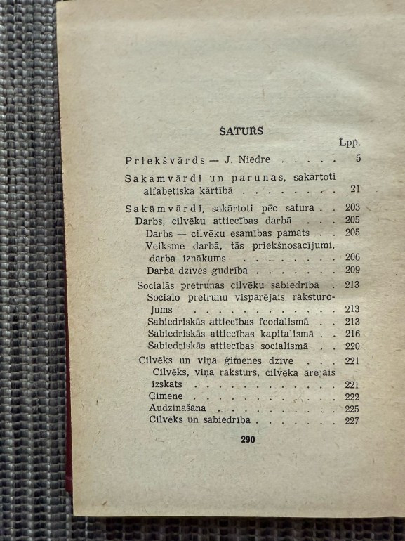 | Tematiski sakārtots krājums ar latviešu tautas sakāmvārdiem un parunām par dzīvi, gudrību, mīlestību, laimi, čaklumu u.c. Asprātīgi izteicieni, kas atklāj tautas dzīvesziņu. | |