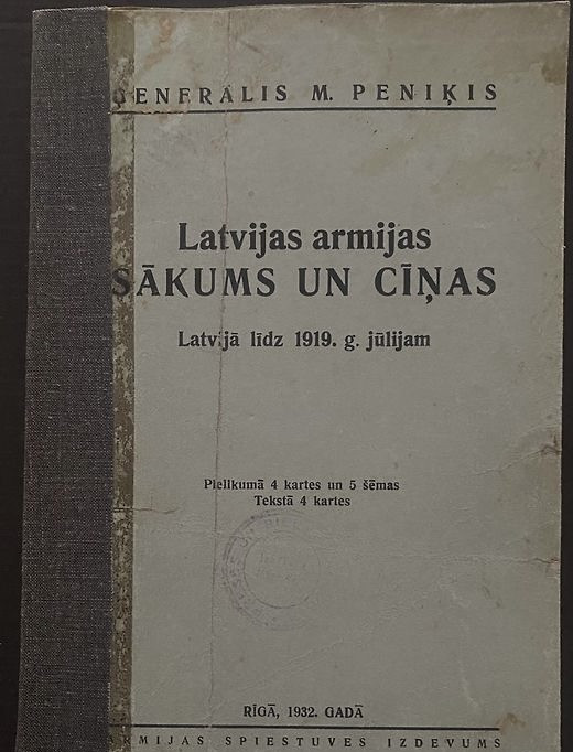 | Latvijas armijas sākums un kaujas Latvijā līdz 1919. gada jūlijam". Tekstā arī norādīts, ka grāmata bija Armijas tipogrāfijas izdevums, un tajā ir iekļauts Iekšlietu ministrijas Preses un asociācijas departamenta zīmogs, kas datēts ar 1932. gada 21. decembri. Autors: ģenerālis M. Peniķis Nosaukums: Latvijas armijas sākums un kaujas Latvijā līdz 1919. gada jūlijam Izdošanas datums: 1932 Izdevējs: | |