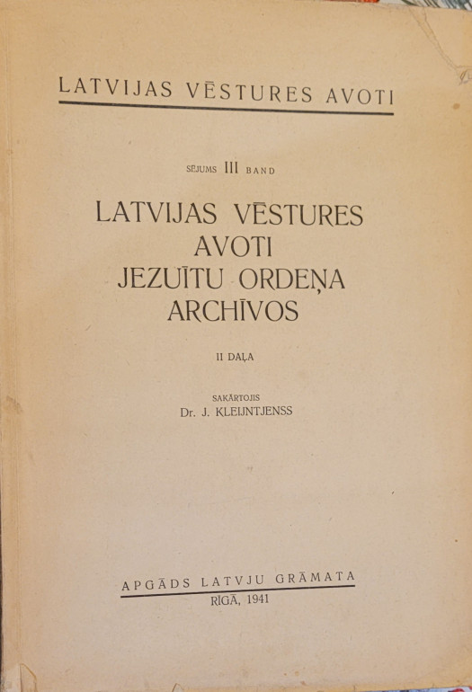 | Latvijas Vēstures Avoti III sējums Jezuītu ordeņa archivos II daļa, 1941.gada izdevums, 533 lpp., labā stāvoklī, atrodas Rīgā, sūtu, ātrākai saziņai WhatsApp tālr.29535459. | |