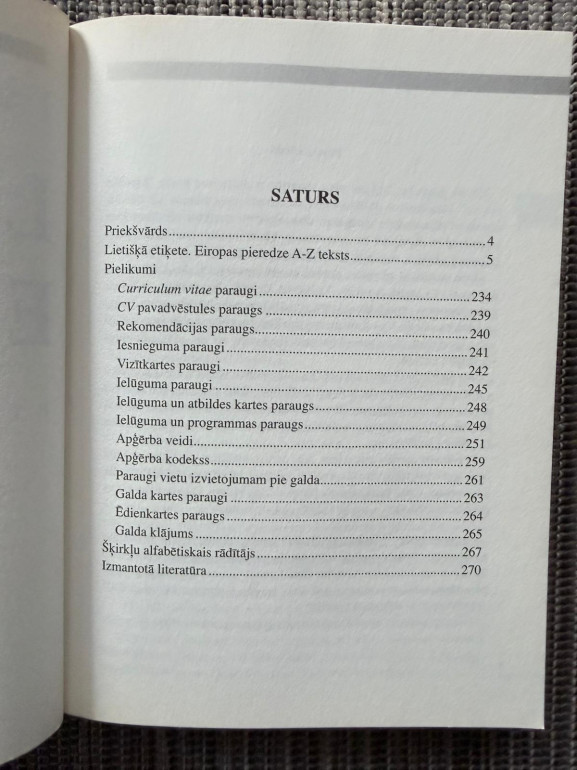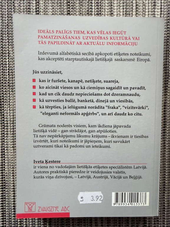 | Grāmata “Lietišķā etiķete. Eiropas pieredze” (Iveta Ķestere) ir praktiska rokasgrāmata par uzvedības un saskarsmes normām biznesa vidē ar Eiropas fokusu — alfabētiski sakārtoti šķirkļi, skaidri padomi un pielikumi ar CV, pavadvēstules, rekomendācijas, ielūguma u. c. paraugiem. | |