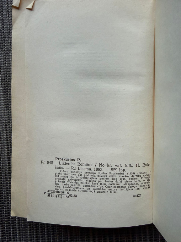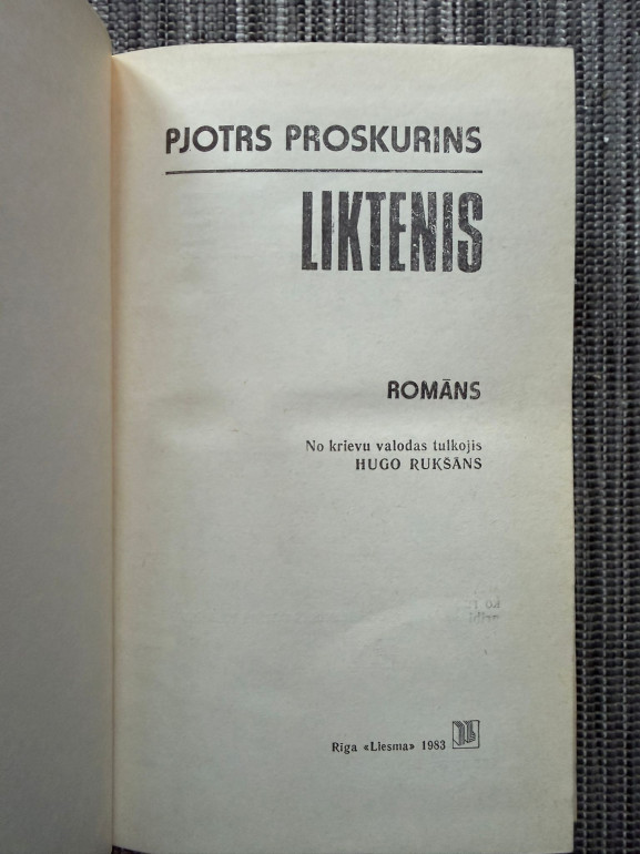 | “Liktenis” – Pjotra Proskurina romāns par padomju cilvēku likteņiem kara un pēckara gados, morālo izvēli un dramatiskajiem notikumiem. Latviešu izdevums: Liesma, 1983, tulkojis H. Rukšāns, 829 lpp. | |