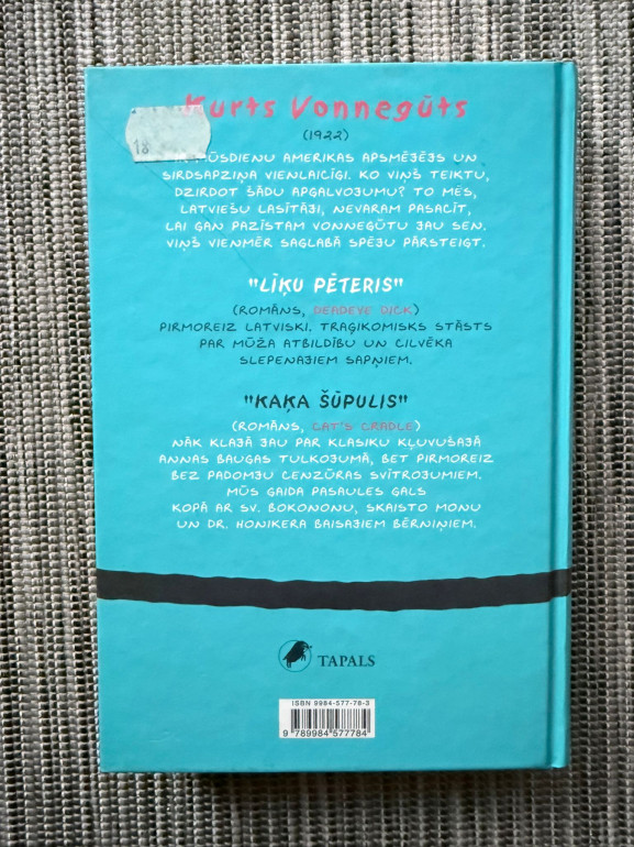 | Divi Vonnegūta romāni vienā sējumā: “Līķu Pēteris” – traģikomisks stāsts par Rūdiju Volcu, kura nejaušā slepkavība un Midlendsitijas neitronbumbas traģēdija izaicina vainas apziņu; “Kaķa šūpulis” – melna satīra par zinātnes bezatbildību un mītisko “ledus‑deviņi” pasaules galu. Asprātīgi, skarbi, vonnegūtiski. | |