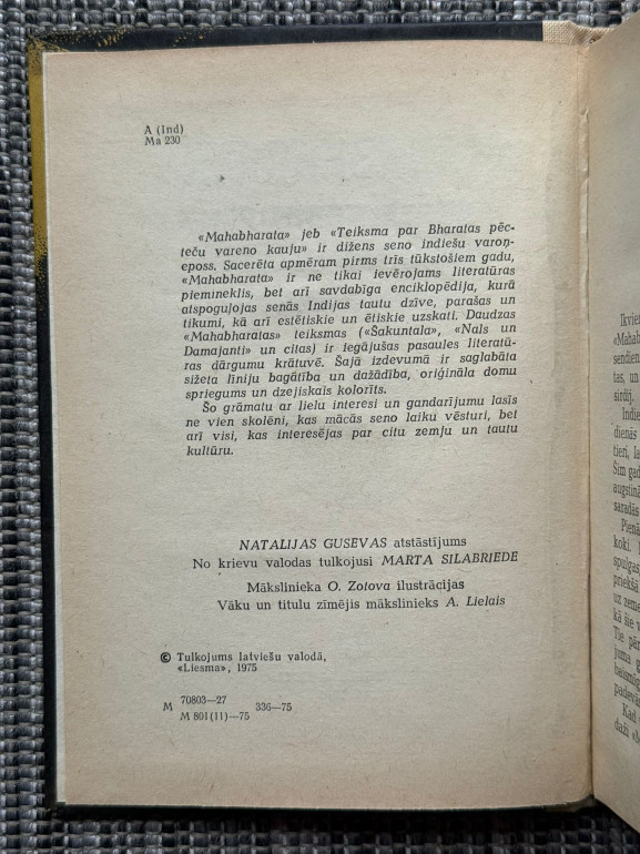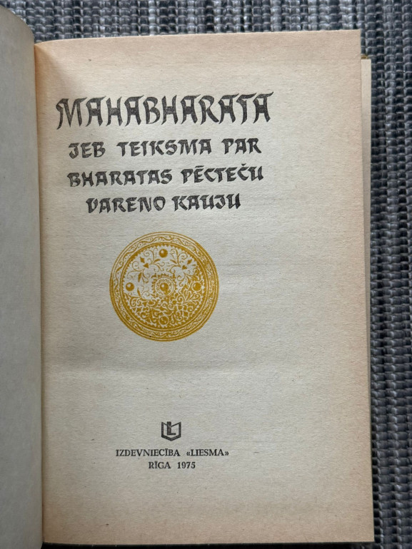 | Senindiešu eposs par Pandavu un Kauravu cīņu Kurukšetras kaujā. Tajā savijas mīti, filozofija un Bhagavadgīta – dialogs par pienākumu un dzīves jēgu. Darbs par cilvēka dabu, morāli un likteni. | |