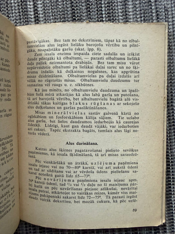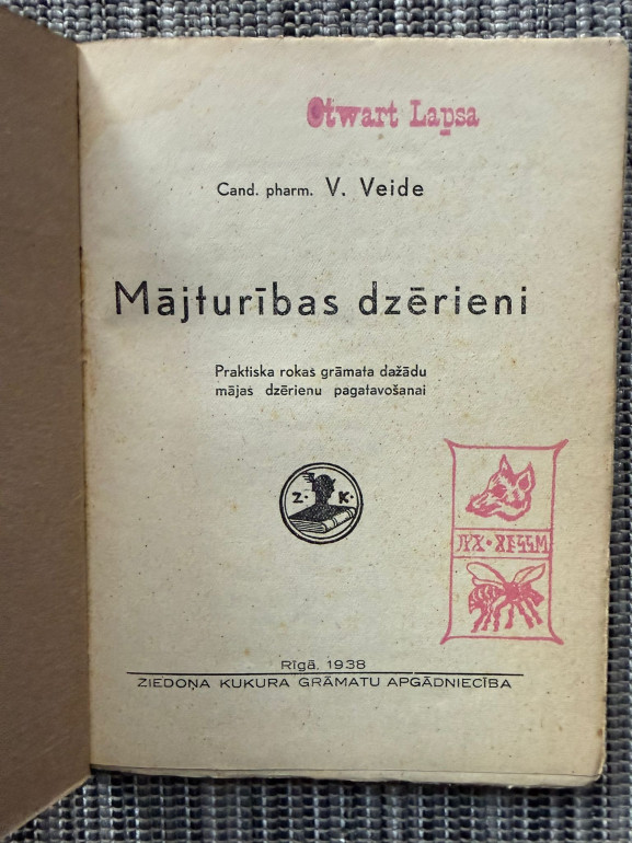 | “Mājturības dzērieni” (V. Veide, 1938) – praktiska rokasgrāmata par dažādu mājas dzērienu pagatavošanu: alus, kvass, vīns, augļu un ogu sulas. Sniedz tehnoloģijas aprakstu un biežāk pieļauto kļūdu analīzi. 71 lpp., izdevējs Ziedoņa Kukura grāmatu apgādniecība, Rīga. | |