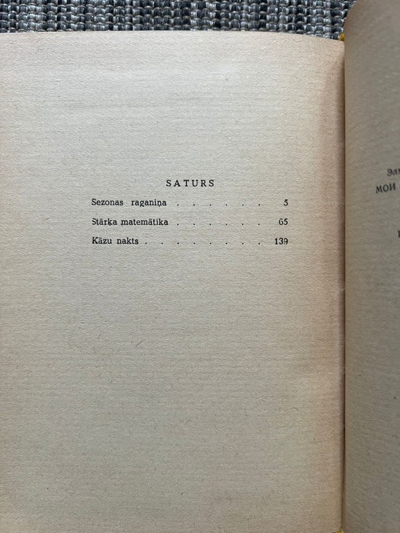 | Krājumā iekļautas lugas “Sezonas raganiņa”, “Stārķa matemātika”, “Kāzu nakts”. Komēdijas ar sadzīvisku humoru, raksturu kontrastiem un asprātīgām situācijām. | |