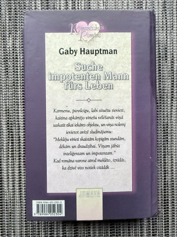 | Grāmata Meklēju impotentu vīrieti (Gabija Hauptmane) ir asprātīga, ironiska komēdija par attiecībām, mīlestību un kompromisiem. Galvenā varone, nogurusi no vīriešu ambīcijām un krāpšanām, izsludina neparastu sludinājumu, kas izraisa virkni pārsteidzošu un smieklīgu notikumu. | |
