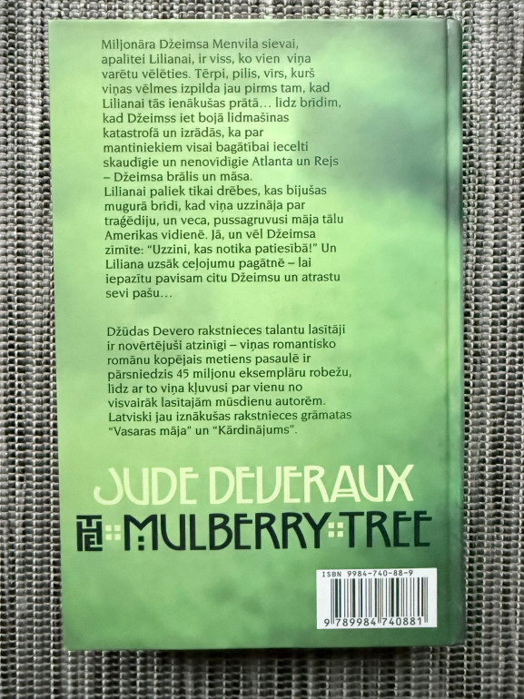 | Grāmata “Melnais zīdkoks” ir Džūdas Devero romantiska drāma ar noslēpuma pavedienu par Liliānu Menvilu, kura pēc miljardiera vīra bojāejas atstāta bez bagātības un ar vienu vienīgu mantojumu—nolaistu lauku māju Virdžīnijā—dodas atklāt patiesību par vīra pagātni un atrod gan jaunu dzīvi, gan drosmi un mīlestību. | |
