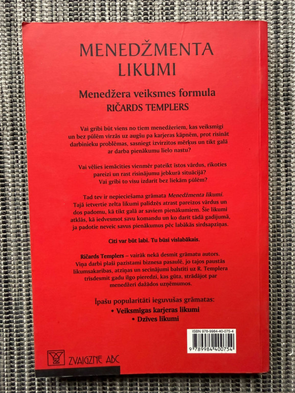 | “Menedžmenta likumi” ir praktisks vadības rokasgrāmata, kurā Ričards Templers piedāvā vairāk nekā 30 pārbaudītus principus veiksmīgai komandas un procesu vadībai: fokusu uz sistēmu izveidi, emocionālo iesaisti, reālistiskiem mērķiem, efektīvām sapulcēm un delegēšanu. Balstīts uz autora 30+ gadu pieredzi, padara grāmatu piemērotu gan pieredzējušiem vadītājiem, gan iesācējiem. | |