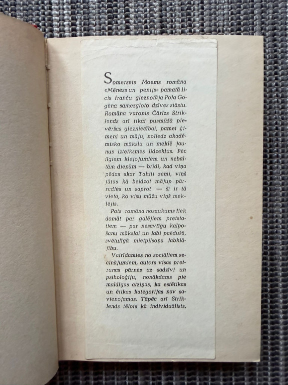 | Romāns, iedvesmots no gleznotāja Pola Gēna dzīves; stāsts par mākslinieku, kas pamet sabiedrību, lai dzīvotu un radītu pēc sava aicinājuma. | |