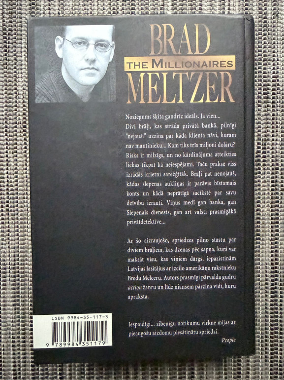 | Grāmata “Miljonāri” ir Breda Melcera finanšu trilleris par diviem brāļiem, kas, izmantojot bankas sistēmas robus, izlemj “paņemt nedaudz”, bet netīšām ievelk sevi daudzmiljonu afērā. Seko federāla vajāšana, slepenas struktūras un konspirācija, kurā lojalitāte un ģimenes saites tiek pārbaudītas līdz galējībām. | |