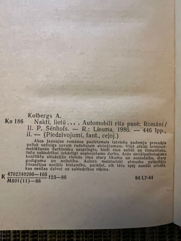 “Naktī, lietū... Automobilī rīta pusē” ir Andra Kolberga divi kriminālromāni, kuros padomju milicijas inspektori izmeklē slepkavības un valsts īpašuma izlaupīšanu. Pirmajā stāstā atklājas medicīnas sistēmas ēnas puses, otrajā – deficīta preču afēras. Romāni apvieno spriedzi, sociālu kritiku un padomju laika atmosfēru. | |