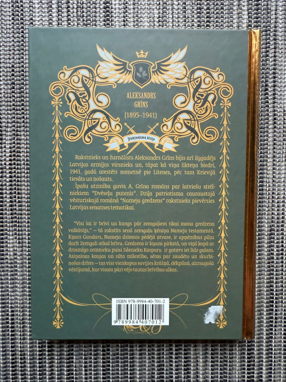 | Aleksandra Grīna vēsturiskais romāns "Nameja gredzens" ir darbs, kas balstīts latviešu senatnes motīvos, īpaši zemgaļu brīvības cīņās pret vācu krustnešiem. Romāns izceļ Nameju – leģendāru Zemgales valdnieku, kurš simbolizē brīvības, goda un tautas pašapziņas ideālus. Grīns savā darbā apvieno vēsturiskus faktus ar literāru izdomu, radot spēcīgu nacionālās identitātes tēlojumu. | |