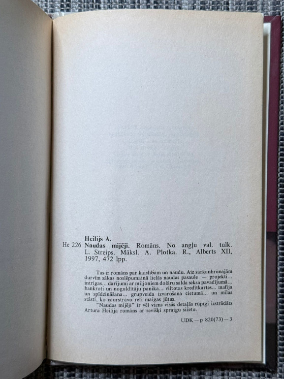 | Grāmata “Naudas mijēji” ir Artura Heilija korporatīvs trilleris par varas cīņu un intrigām lielā ASV bankā: valdes politika, noguldītāju panika, kredītkaršu viltojumi un drošības operācijas. Aizraujošs, detalizēts skats uz 70. gadu banku sistēmu, mantkārību un atbildību | |