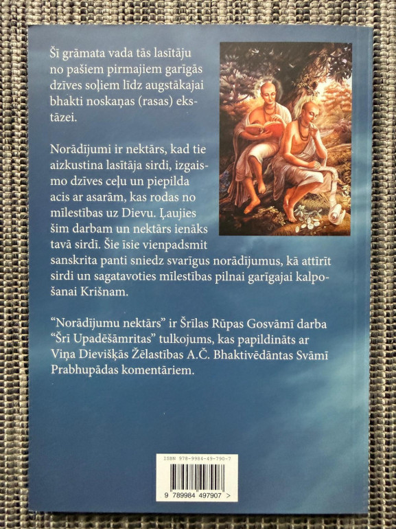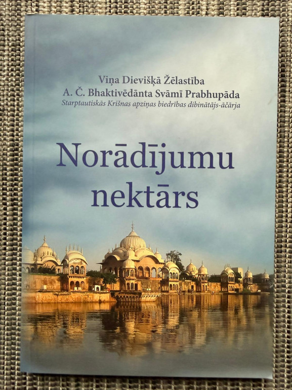 | Grāmata “Norādījumu nektārs” ir Šrī Rūpagosvāmī 11 pantu traktāts (Upadēšāmrita) ar A.Č. Bhaktivēdāntas Svāmī Prabhupādas komentāriem. Praktisks ceļvedis bhakti jogā: prāta un jutekļu savaldīšana, sešas labvēlīgas/kaitīgas darbības, mīlestības apmaiņa bhaktu vidū un augstākais mērķis — tīra mīlestība uz Krišnu. | |