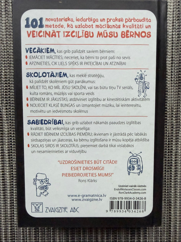 | Rona Klārka ceļvedis, kā padarīt mācīšanos dzīvīgu: 101 risinājums skolotājiem un vecākiem—no augstām gaidām un skolas ieradumiem līdz radošai klasei un stiprām attiecībām. Balstīts Ron Clark Academy pieredzē; iedvesmo lauzt stereotipus un atraisīt bērnu spējas | |