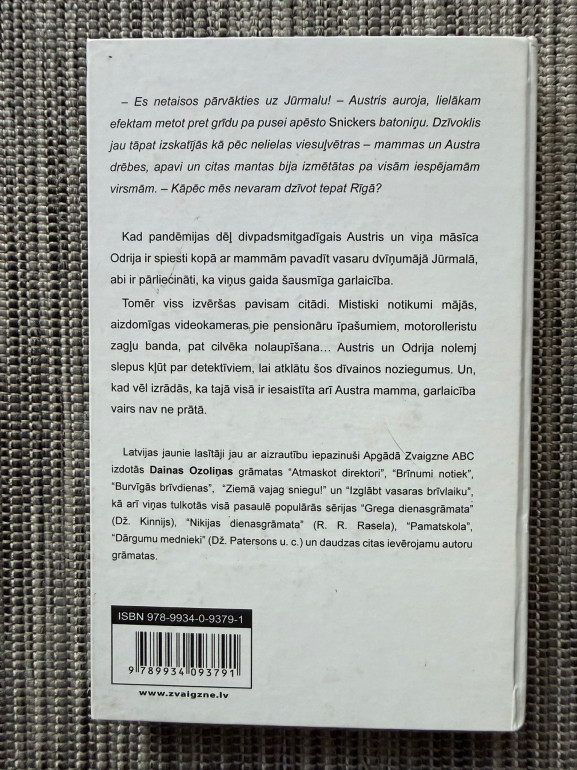 | Grāmata “Pandēmijas detektīvi” ir asprātīgs piedzīvojumu detektīvs par 12‑gadīgo Austri un māsīcu Odriju, kuri pandēmijas vasaru Jūrmalā pārvērš izmeklēšanā: aizdomīgas kameras pie pensionāru mājām, motorolleristu zagļu banda un pat nolaupīšana. Tēmas: drosme, draudzība, ģimenes noslēpumi. | |