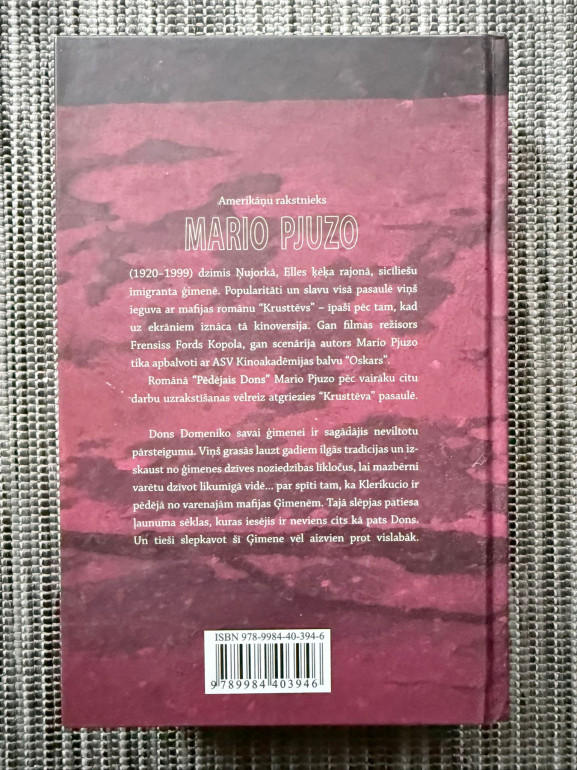 | „Pēdējais Dons” (1996) ir Mario Pjuzo romāns par itāļu–amerikāņu mafijas pasauli. Tas vēsta par spēcīgu noziedzīgu ģimeni, varu, lojalitāti un mēģinājumiem pārvērst kriminālu impēriju par cienījamu biznesu. Grāmata izceļas ar reālistisku mafijas attēlojumu un psiholoģisku dziļumu. | |