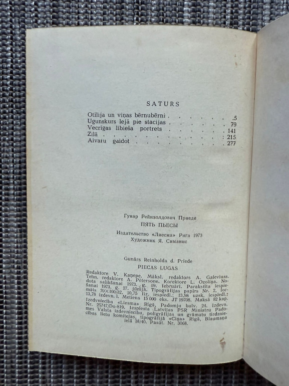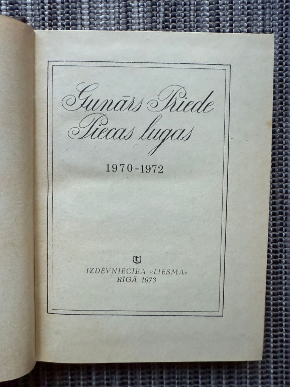 | Grāmata "Gunārs Priede. Piecas lugas" ir latviešu dramaturga darbu krājums, kurā apkopotas piecas lugas: Otīlija un viņas bērnubērni, Ugunskurs lejā pie stacijas, Vecīgais lībieša portrets, Zilā un Aivaru gaidot. Tēmas aptver ģimenes attiecības, vēsturiskus portretus un gaidīšanas motīvus. Izdevniecība Liesma, 1973. gads. | |