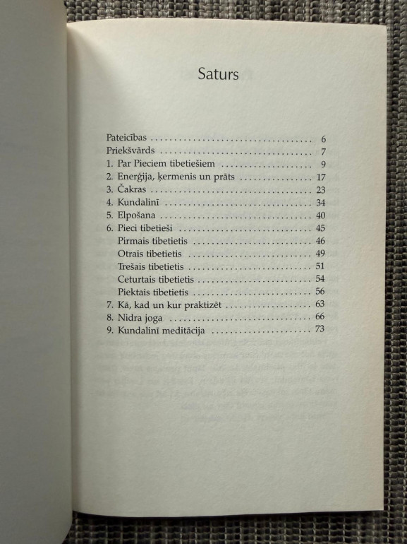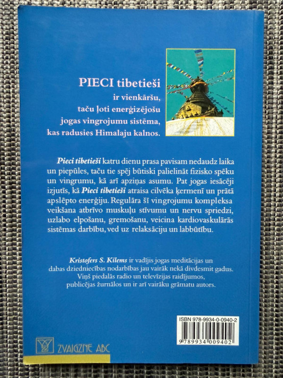 | “Pieci tibetieši” (autors Kristofers S. Kilems) iepazīstina ar piecu vienkāršu, bet ļoti enerģizējošu jogas vingrojumu sistēmu no Himalajiem. Ikdienas prakse palielina spēku un elastību, mazina spriedzi, uzlabo elpošanu un gremošanu, veicina relaksāciju un čakru harmoniju; iekļautas elpošanas un meditācijas vadlīnijas. | |