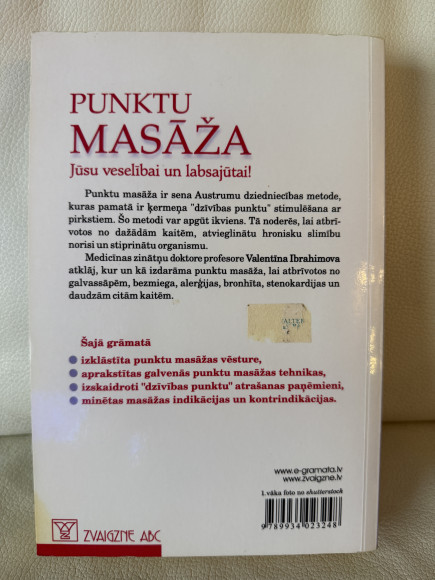 | praktiska rokasgrāmata par akupresūru – organisma līdzsvarošanas metodi, kas balstās uz bioloģiski aktīvo punktu stimulāciju. Valentīna Ibrahimova saprotami izskaidro meridiānu un punktu izvietojumu, to saistību ar orgānu sistēmām un sniedz norādes, kā maigiem spiediena paņēmieniem mazināt sāpes, spriedzi un nogurumu, uzlabot miegu un pašsajūtu. Grāmatā apkopoti soli pa solim aprakstīti paņēmieni | |