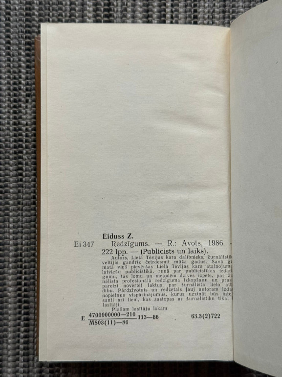 | “Redzīgums” — prozas darbs, publicēts 1986. gadā. Tas atspoguļo autora redzējumu uz dzīvi, cilvēkiem un sabiedrību. Grāmata ieved pārdomās par cilvēka dabu, vērtībām un laiku, kad dzīve liek izvēlēties starp ideāliem un realitāti. | |