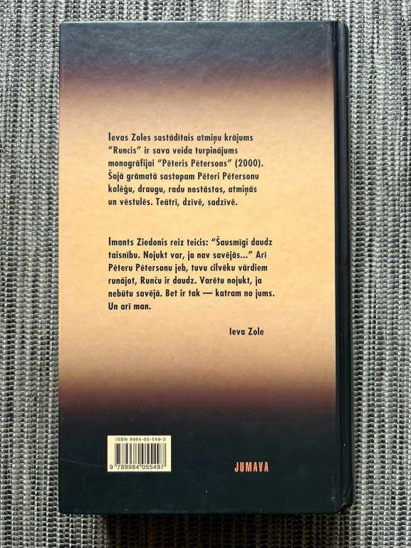| Apjomīgo atmiņu krājumu, kurā apkopotas kolēģu, radinieku, draugu atmiņas, nostāsti un vēstules par Pētēri Pētersonu jeb Runci, var uzskatīt par turpinājumu Ievas Zoles monogrāfijai Pēteris Pētersons (2000). Krājuma sastādītāja teic, ka Pēteru Pētersonu ir daudz. Tik daudz, cik ir to, kas viņu atminas. | |
